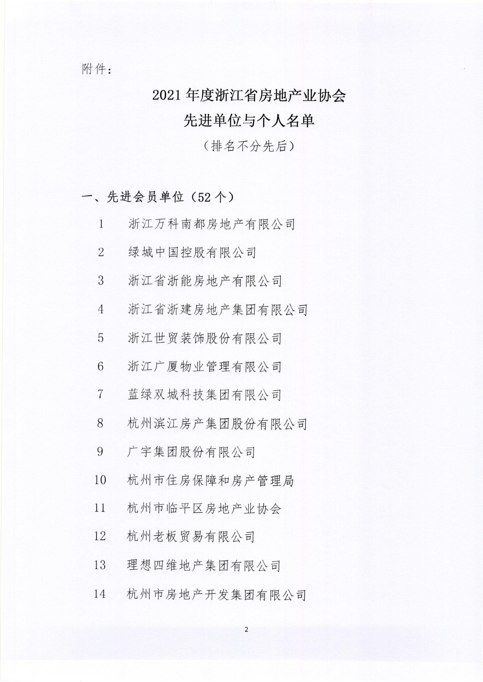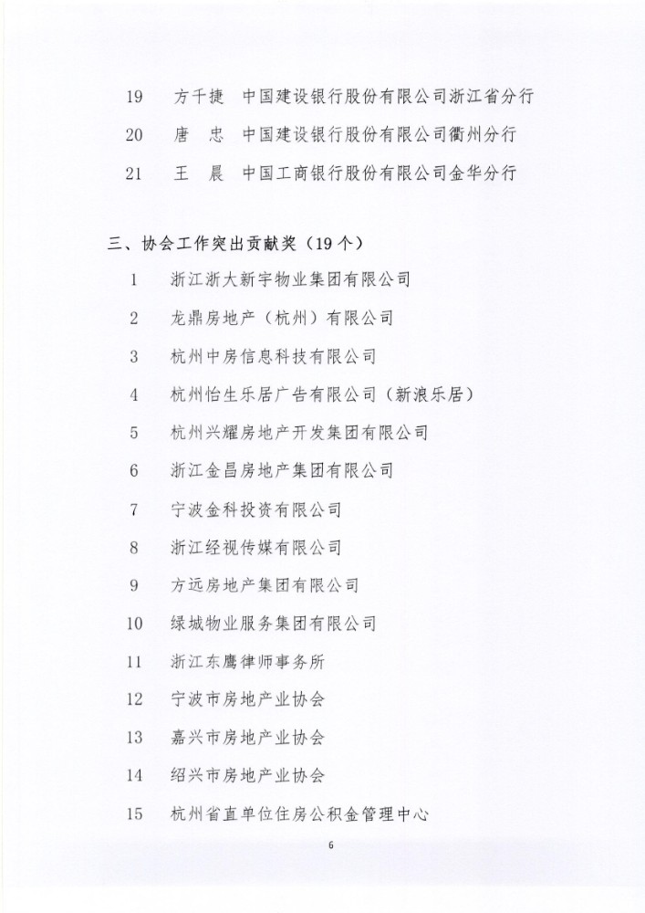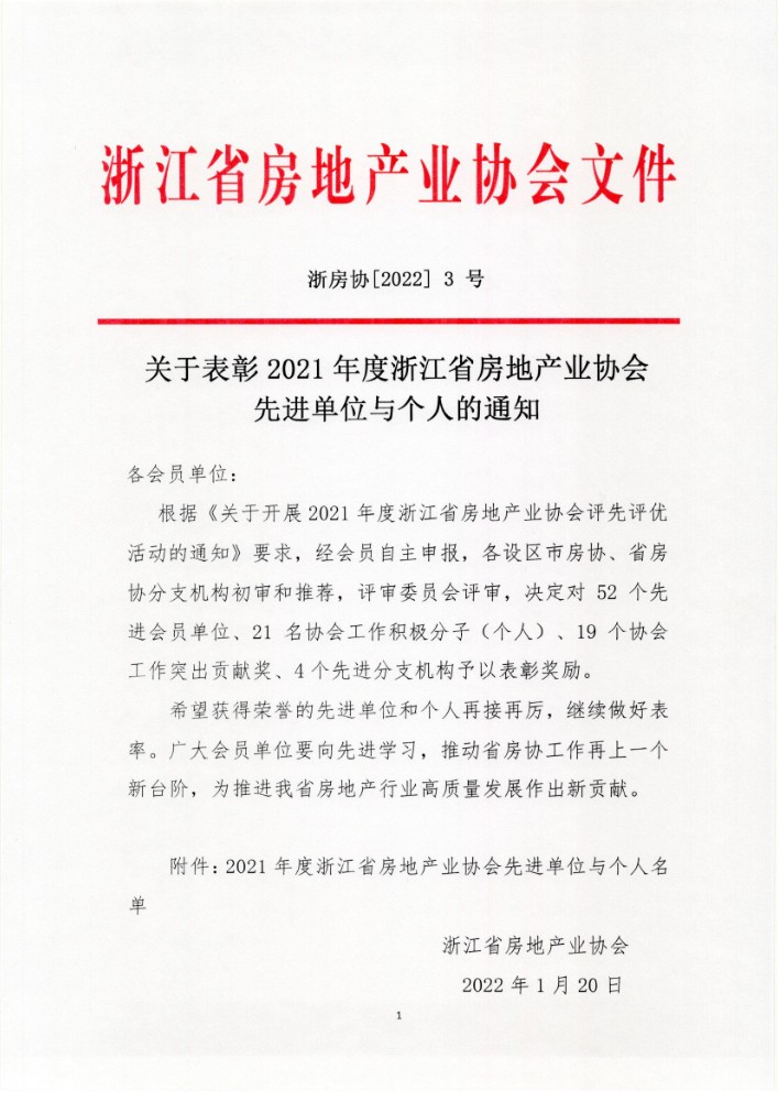1月20日,经浙房协评审委员会审定,宁波市房地产业协会荣获2021年度浙江省房地产业协会“协会工作突出贡献奖”,宁波市房协四家会员单位——荣安地产股份有限公司、宁波南天控股集团有限公司、宁波市天天红利房地产信息咨询有限公司和宁波市甬旺房产经纪有限公司获2021年度浙江省房地产业协会“先进会员单位”荣誉称号。